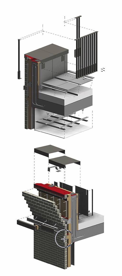 This process began with standard 2D details, which were then translated into highly detailed 3D BIM families. Each layer – whether structural, thermal, waterproofing or finish – was virtually assembled, validated, and documented. The sequence was then visually displaced to create a step-by-step breakdown of the full build-up, allowing contractors to understand not only what to build, but exactly how and when to build it.