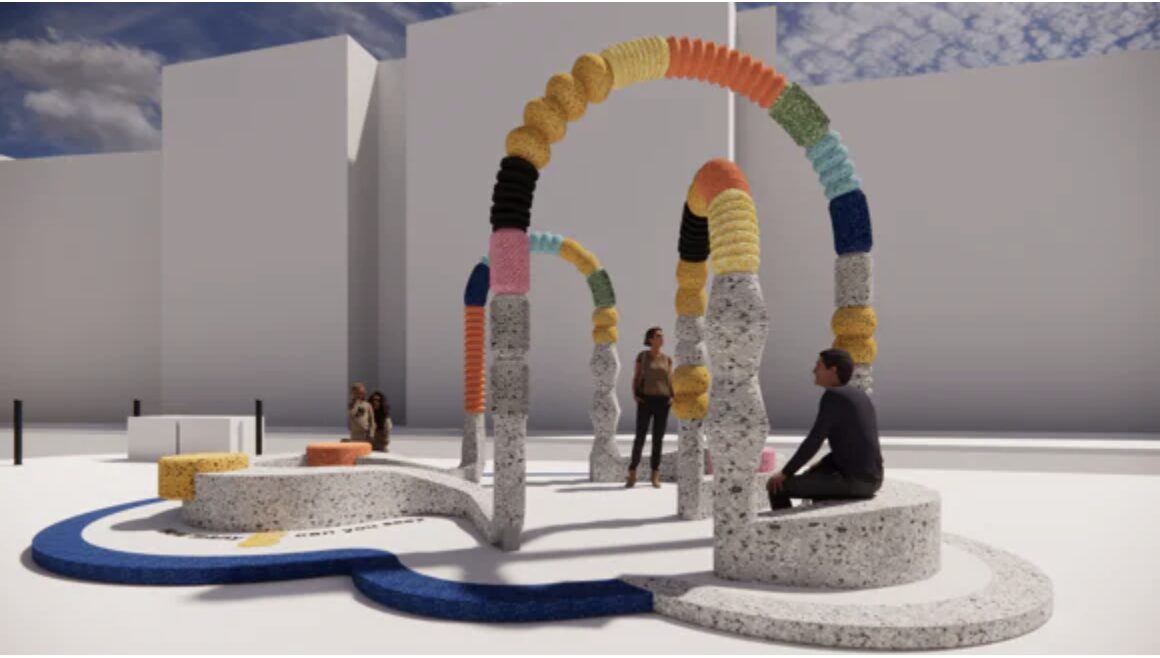 Two of the Design Interventions selected for this year will be on Clerkenwell Green. The Fountain of Technicolour Beads has been created by Hong Kong-based multi-disciplinary studio One Bite Design. And next to St James’ Church will be The Crinkle-Crankle Bench, a series of half crescent benches crafted from natural stone bricks is designed by architectural practice StudioFolk.